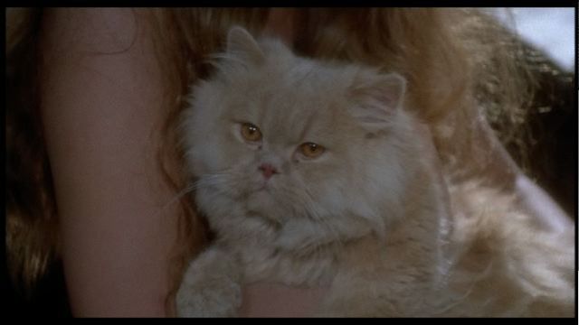 Dario Argento’s horror film is a major cat movie, and showcases cats in a variety of different settings. In Rome, music student Mark Elliot (Leigh McCloskey) gets a letter from his sister Rose in New York telling him about The Three Mothers, evil sisters who rule the world. Mark reads the letter during a class while Verdi’s Va, pensiero chorus from Nabucco is playing. Something is making him uncomfortable; he looks up to find a young woman (Ana Pieroni) and her fluffy cat staring at him intently.