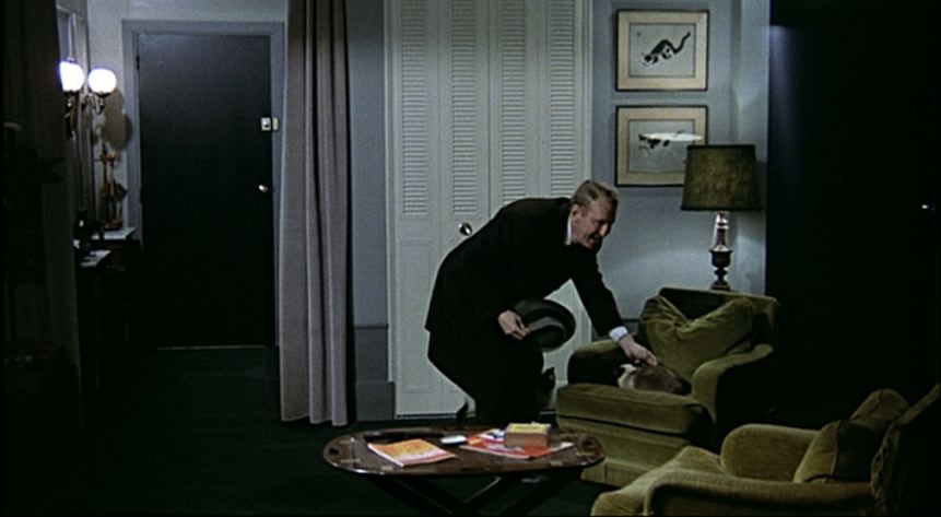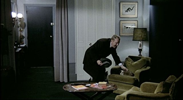 Meanwhile, all we get to see of his personal life are two almost identical scenes in which he arrives home, greets his cats – their names are Fiorello, Ofrène and Grifollet – and feeds them. Note the cat pictures on the wall.