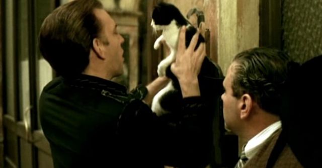 It’s not enough that Attila is evil – we have to see him being evil. So he ties a black and white cat to the wall with his belt and head-butts it to death.