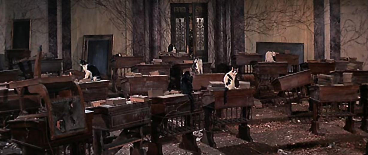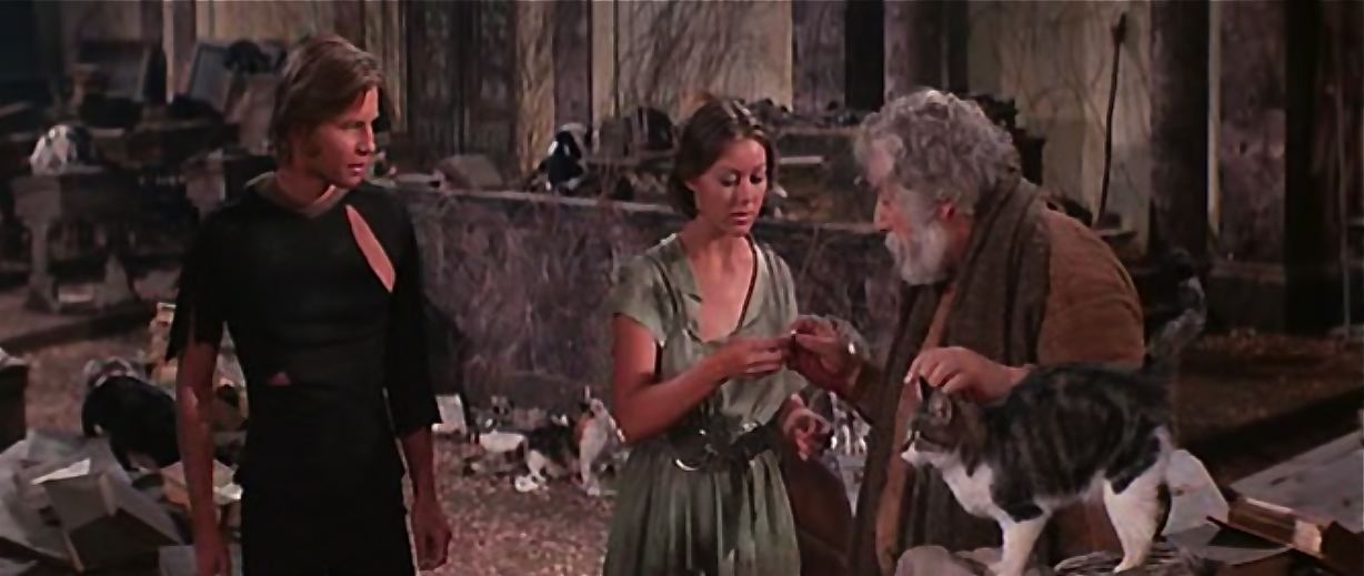 Peter Ustinov, for it is he, goes on to quote extensively from TS Eliot‘s Old Possum’s Book of Practical Cats (let us hope MGM squared the rights with Faber & Faber in advance), offers to trade a calico cat for the jewel embedded in Logan’s palm, and lets Jessica touch the cracks in his face. But these bits of business will only be at the periphery of the average cat lover’s attention, which by now will be fully engaged in trying to check out all the cats that are milling around and mewing the ruins of the Capitol in Washington DC.